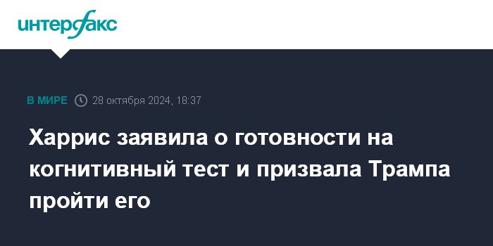 Москва. 28 октября. INTERFAX.RU - Кандидат в президенты США от Демократической партии Камала Харрис в интервью CBS News выразила готовность пройти тест на когнитивные способности и призвала экс-президента Дональда Трампа тоже это сделать.