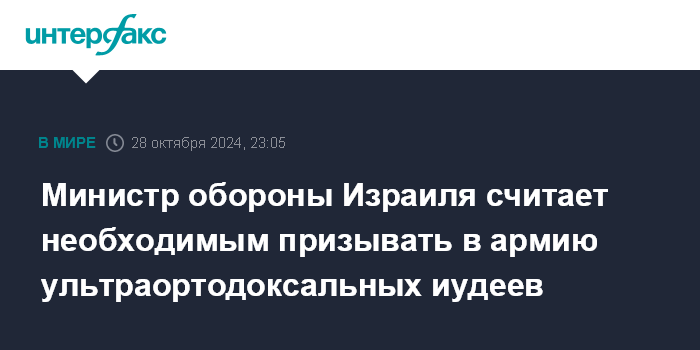 Москва. 28 октября. INTERFAX.RU - Израильская армия нуждается в большем числе военнослужащих, поэтому призыв в армию ультраортодоксальных иудеев (харедим) на службу - необходимая мера, заявил в понедельник глава МО Израиля Йоав Галант.