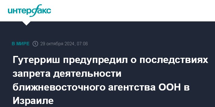 Москва. 29 октября. INTERFAX.RU - Запрет Израиля на деятельность ближневосточного агентства ООН по помощи палестинским беженцам и организации работ (БАПОР) может иметь "разрушительные последствия", считает генсек ООН Антониу Гутерриш.