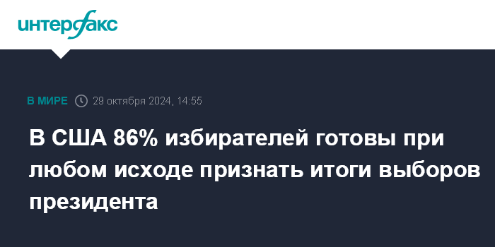 Москва. 29 октября. INTERFAX.RU - До 86% зарегистрированных избирателей в США выразили готовность принять исход президентских выборов, независимо от победы того или иного кандидата, свидетельствуют результаты опроса общественного мнения, проведенного ABC и социологической службой Ipsos.