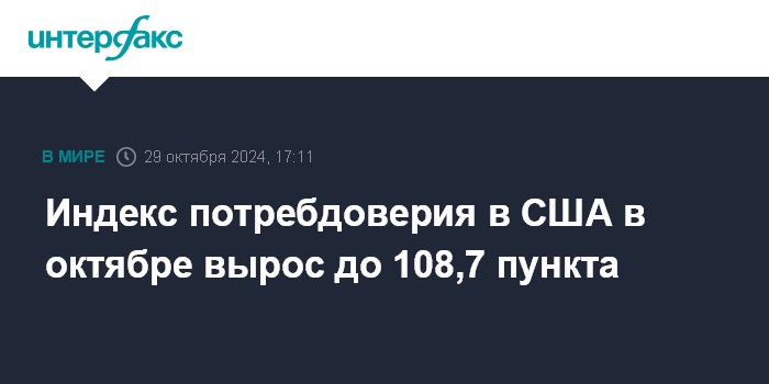 Москва. 29 октября. INTERFAX.RU - Индекс потребительского доверия в США в октябре поднялся до 108,7 пункта. Об этом говорится в отчете исследовательской организации Conference Board, которая рассчитывает этот индикатор.