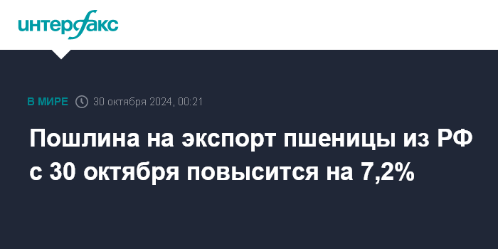 Москва. 30 октября. INTERFAX.RU - Ставка пошлины на экспорт пшеницы из РФ с 30 октября повысилась на 7,2%, до 2 тыс. 227,9 рубля за тонну.