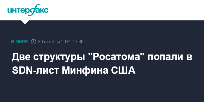 Москва. 30 октября. INTERFAX.RU - "Росатом Цифровые решения" и "Росатом Микроэлектроника" вошли в SDN лист Минфина США, говорится в опубликованном в среду обновлении списка.