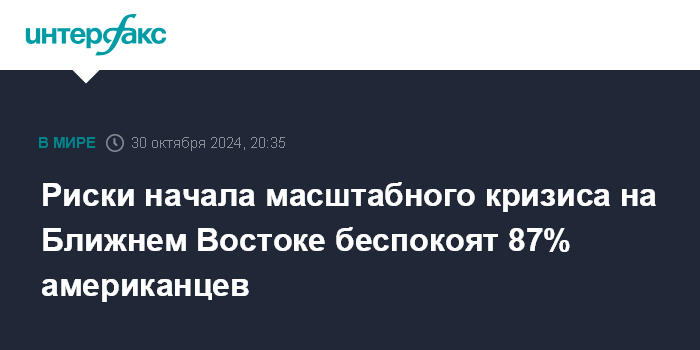 Москва. 30 октября. INTERFAX.RU - Вероятность начала более масштабного конфликта в ближневосточном регионе вызывает обеспокоенность примерно у 87% американцев, показал опрос AP-NORC. Социологи с 11 по 14 октября опросили в США 1072 зарегистрированных избирателя. Допустимая погрешность выборки - 4,2 п.п.