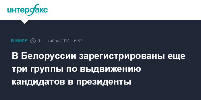 Москва. 31 октября. INTERFAX.RU - Центризбирком Белоруссии зарегистрировал еще три группы по выдвижению кандидатов в президенты республики. Прямая трансляция заседания шла на сайте комиссии.