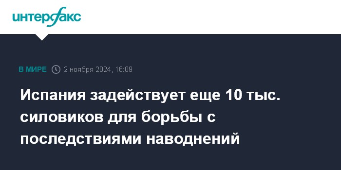 Москва. 2 ноября. INTERFAX.RU - Власти Испании направят еще 10 тыс. военных и полицейских на восток страны в регион Валенсия в связи с разрушительными наводнениями, сообщает в субботу агентство Associated Press (AP) со ссылкой на заявление испанского премьера Педро Санчеса.