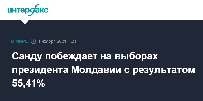 Москва. 4 ноября. INTERFAX.RU - Действующий президент Молдавии Майя Санду одержала победу во втором туре выборов президента, который состоялся 3 ноября.
