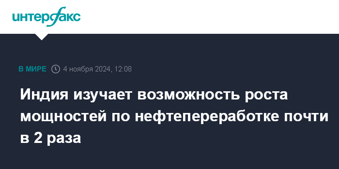 Москва. 4 ноября. INTERFAX.RU - Индия уже имеет планы по увеличению нефтеперерабатывающих мощностей до 300 млн т с текущих примерно 250 млн т и изучает вопрос по еще большему их наращиванию, сообщил журналистам индийский министр нефти и природного газа Шри Хардип Сингх Пури в кулуарах конференции Adipec.