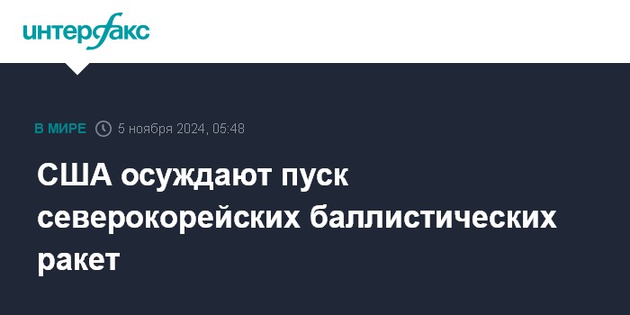 Москва. 5 ноября. INTERFAX.RU - США осуждают пуск Северной Кореей многочисленных баллистических ракет, заявили в американском Госдепартаменте.
