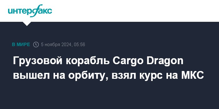 Москва. 5 ноября. INTERFAX.RU - Многоразовый грузовой космический корабль Cargo Dragon компании SpaceX, запущенный во вторник по московскому времени, успешно вышел на орбиту, взял курс на Международную космическую станцию (МКС), сообщило NASA.