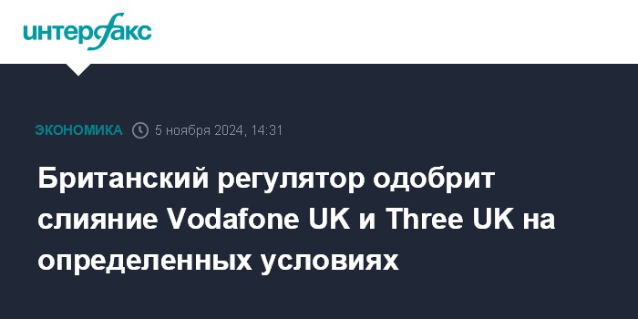 Москва. 5 ноября. INTERFAX.RU - Британское Управление по защите конкуренции и рынкам (Competition and Markets Authority, CMA) готово одобрить сделку по слиянию оператора связи Vodafone UK и конкурирующей Three UK при выполнении компаниями определенных условий.