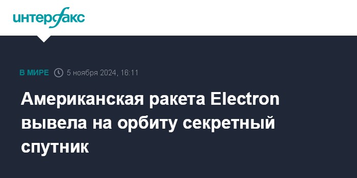 Москва. 5 ноября. INTERFAX.RU - Американская ракета Electron легкого класса, стартовавшая во вторник из Новой Зеландии, вывела на низкую околоземную орбиту спутник "конфиденциального коммерческого заказчика", сообщила компания-разработчик носителя Rocket Lab.