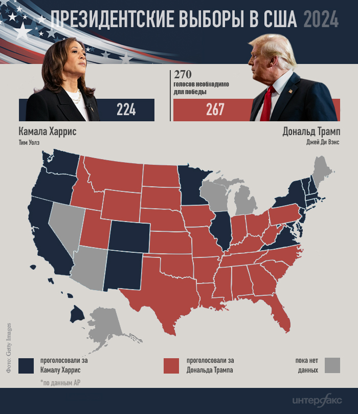 Согласно подсчету телеканала CNN, Трамп набирает 246 голосов из необходимых для победы 270. В свою очередь телеканал Fox News сообщает, что он получает 248 голосов.