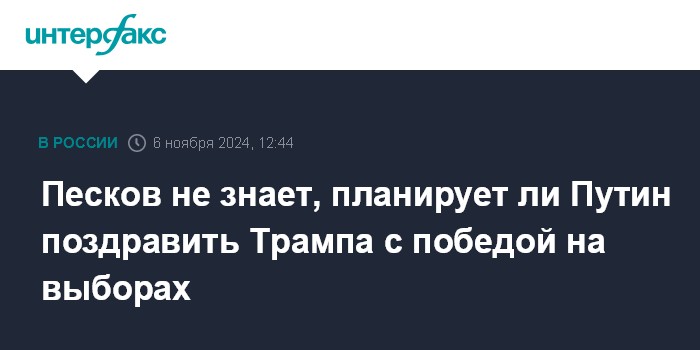 Песков не знает, планирует ли Путин поздравить Трампа с победой на выборах