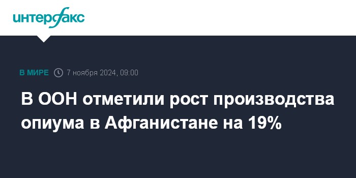 Москва. 7 ноября. INTERFAX.RU - В Афганистане в 2024 году производство опиума выросло на 19%, несмотря на введенный талибами (движение "Талибан" признано в России террористическим и запрещено) запрет, сказано в докладе Управления ООН по наркотикам и преступности (УНП ООН).