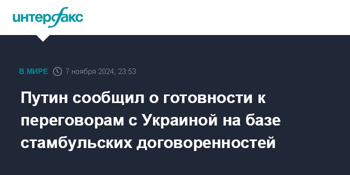 Москва. 7 ноября. INTERFAX.RU - Президент РФ Владимир Путин заявил, что Россия готова к переговорам с Украиной, но на основании стамбульских договоренностей и реалий сегодняшнего дня.