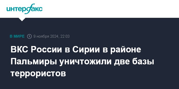 Москва. 9 ноября. INTERFAX.RU - Два пункта базирования террористов в районе сирийской Пальмиры уничтожены ударами Воздушно-космических сил РФ, сообщил в субботу на брифинге для журналистов заместитель руководителя российского Центра по примирению враждующих сторон в Сирии капитан 1-го ранга Олег Игнасюк.