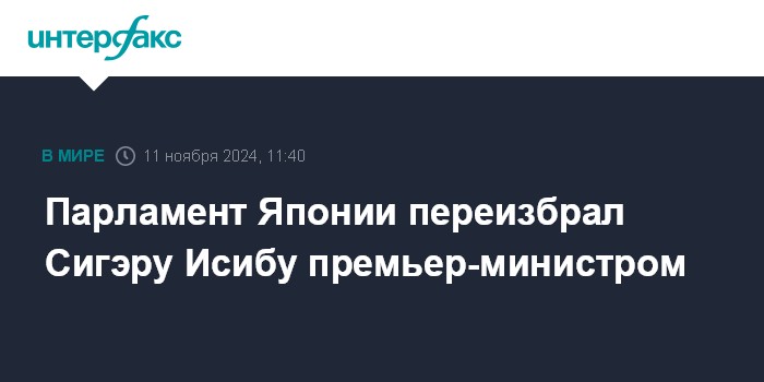 Москва. 11 ноября. INTERFAX.RU - Нижняя палата парламента Японии (Палата представителей) переизбрала лидера правящей Либерально-демократической партии (ЛДП) Сигэру Исибу на должность премьер-министра, передает Kyodo News.