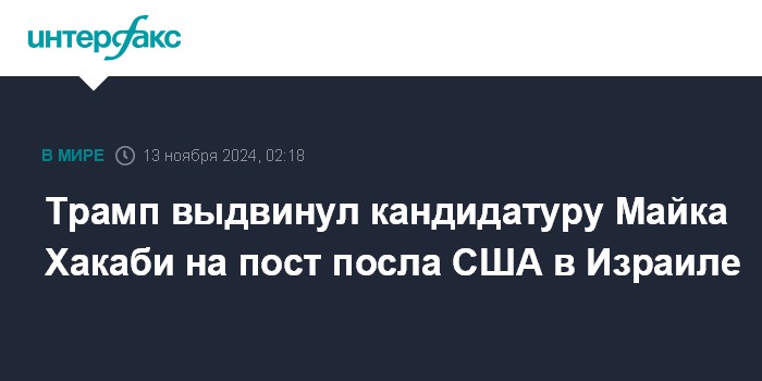 "Высокоуважаемый губернатор Арканзаса Майк Хакаби номинирован на пост посла США в Израиле", - говорится в заявлении Трампа, опубликованном в его телеграм-канале.