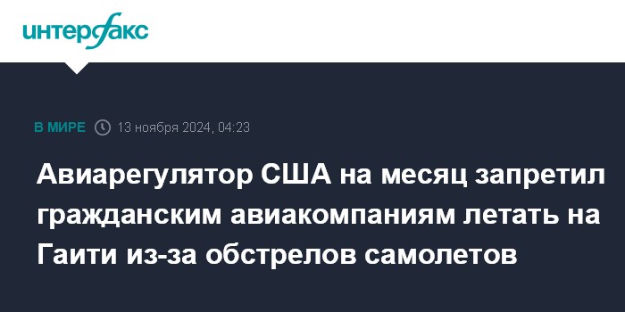Москва. 13 ноября. INTERFAX.RU - Федеральное управление гражданской авиации США (FAA) на месяц приостанавливает полеты американских авиакомпаний на Гаити, сообщил телеканал CNN.