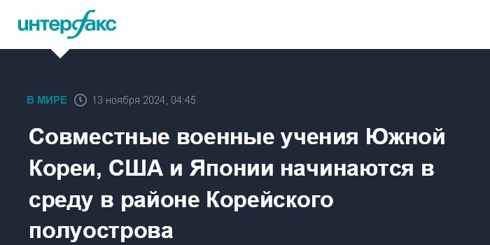 Москва. 13 ноября. INTERFAX.RU - Южная Корея, Соединенные Штаты и Япония начинают в среду трехсторонние военные учения, сообщило агентство "Ренхап" со ссылкой на южнокорейский Объединенный комитет начальников штабов (ОКНШ) ВС Южной Кореи.