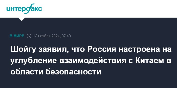 Шойгу заявил, что Россия настроена на углубление взаимодействия с Китаем в области безопасности