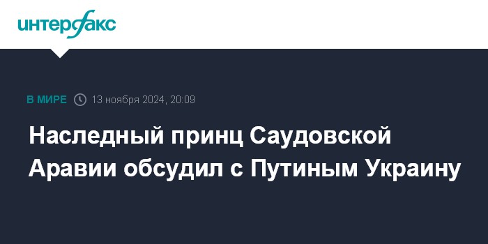 Москва. 13 ноября. INTERFAX.RU - Наследный принц Саудовской Аравии Мухаммед бен Салман Аль Сауд в ходе телефонного разговора с президентом РФ Владимиром Путиным обсудил, в частности, украинский кризис, сообщает в среду Саудовское агентство печати.