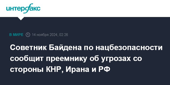Москва. 14 ноября. INTERFAX.RU - Помощник президента США по нацбезопасности Джейк Салливан намерен предупредить своего преемника на посту Майка Уолтца об угрозах, якобы исходящих от Китая, Ирана и России.