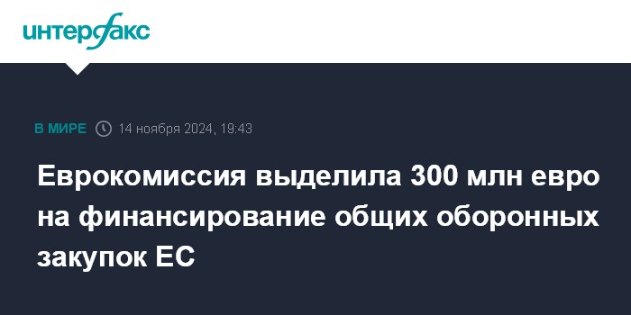 Москва. 14 ноября. INTERFAX.RU - Еврокомиссия объявила о первом в истории транше в 300 млн евро из союзного бюджета общих оборонных закупок государств-членов Евросоюза.