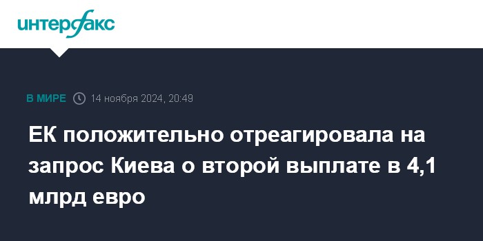 Москва. 14 ноября. INTERFAX.RU - Еврокомиссия одобрила вторую регулярную выплату на сумму около 4,1 млрд евро в рамках фонда ЕС для Украины с целью поддержки макрофинансовой стабильности и функционирования государственного управления.