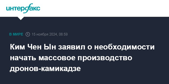 Москва. 15 ноября. INTERFAX.RU - Ким Чен Ын в четверг руководил испытаниями ударных дронов-камикадзе, северокорейский лидер подчеркнул необходимость их массового производства в КНДР, сообщает ЦТАК.