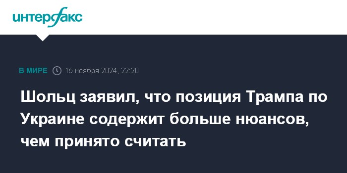 По словам Шольца, у него сложилось впечатление после разговора с Трампом в конце прошлой недели, что позиция избранного президента США содержит "больше нюансов, чем чаще всего предполагается". При этом он не уточнил, в чем именно заключаются нюансы.