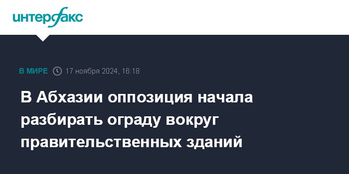 Москва. 17 ноября. INTERFAX.RU - Представители абхазской оппозиции приступили к демонтажу металлической ограды вокруг комплекса правительственных зданий в Сухуме, передает корреспондент "Интерфакса".