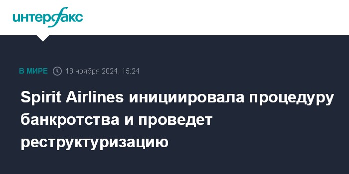 Москва. 18 ноября. INTERFAX.RU - Американская авиакомпания Spirit Airlines Inc. инициировала процедуру банкротства в соответствии со статьей 11 Кодекса о банкротстве США.