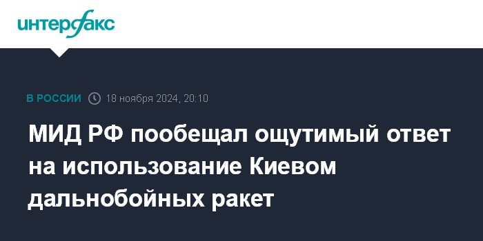 Москва. 18 ноября. INTERFAX.RU - Возможное использование Украиной дальнобойных ракет для атак по территории РФ будет означать прямое участие Вашингтона в боевых действиях, ответ Москвы будет в таком случае "адекватным и ощутимым", заявляют в российском внешнеполитическом ведомстве.