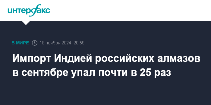 Москва. 18 ноября. INTERFAX.RU - Импорт алмазов из России в Индию в сентябре упал на 96% (почти в 25 раз) по сравнению с данными годичной давности, составив 37 тыс. карат, сообщило министерство торговли и промышленности Индии. Годом ранее было ввезено 917 тыс. карат.