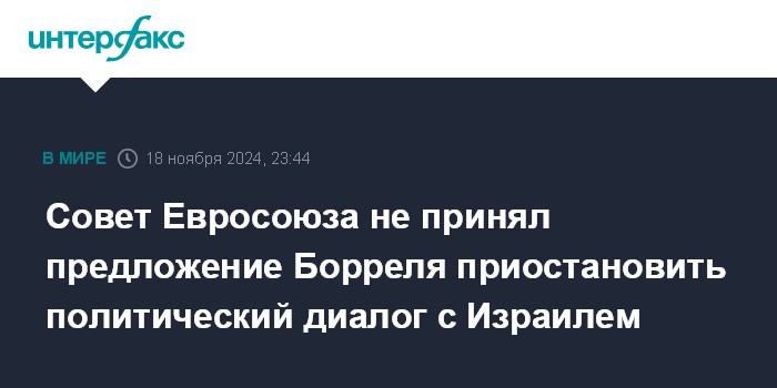 Москва. 18 ноября. INTERFAX.RU - Министры иностранных дел Евросоюза (ЕС) не одобрили предложение о приостановке политического диалога с Израилем, сообщил глава дипломатии ЕС Жозеп Боррель.