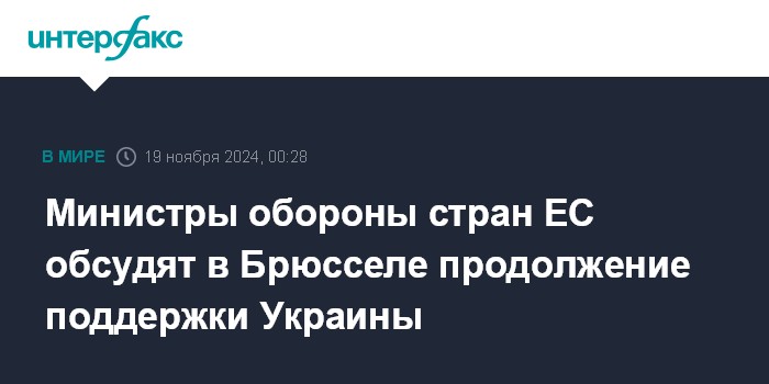 Москва. 19 ноября. INTERFAX.RU - Министры обороны стран Евросоюза на заседании Совета ЕС во вторник в Брюсселе в качестве главного пункта повестки обсудят свою военную помощь Украине.