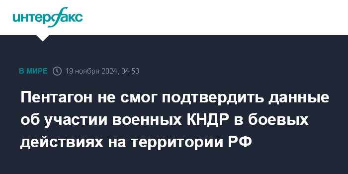 Москва. 19 ноября. INTERFAX.RU - Минобороны США не располагает данными, свидетельствующими об участии северокорейских военных в боевых действиях на территории России, признала представитель Пентагона Сабрина Сингх.