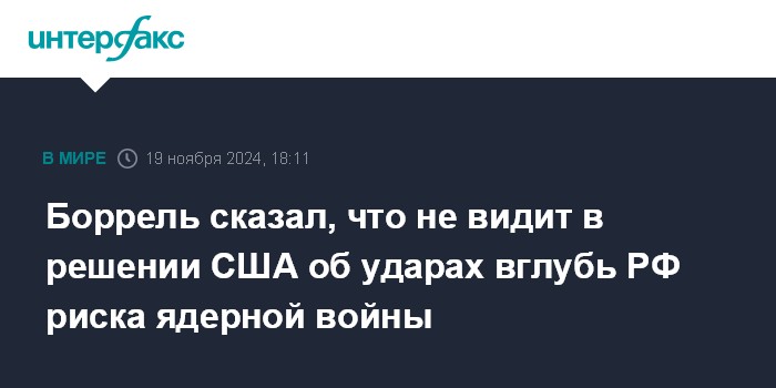 По словам Борреля, он считает, что удары американскими ракетами вглубь России не повышают риск применения ядерного оружия. "Не вижу связи между решением президента Байдена и риском ядерной войны", - сказал он.