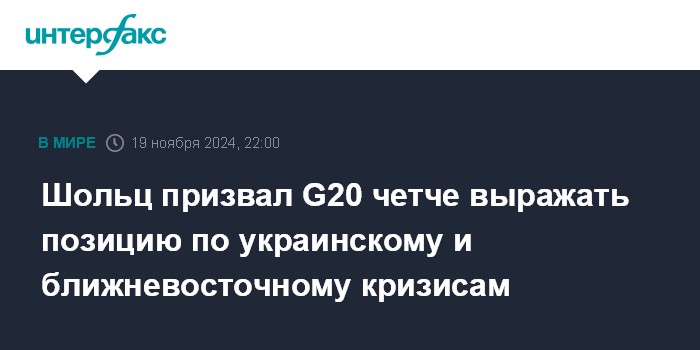 Москва. 19 ноября. INTERFAX.RU - Канцлер Германии Олаф Шольц выразил мнение, что в коммюнике стран G20 недостаточно ясно выражена их позиция по отношению к украинскому кризису и ближневосточному конфликту, сообщают западные СМИ.