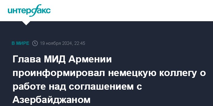 Москва. 19 ноября. INTERFAX.RU - Министр иностранных дел Армении Арарат Мирзоян на встрече с главой МИД Германии Анналеной Бербок в Ереване во вторник проинформировал ее о работе по завершению мирного соглашения между Ереваном и Баку, сообщает армянское внешнеполитическое ведомство.