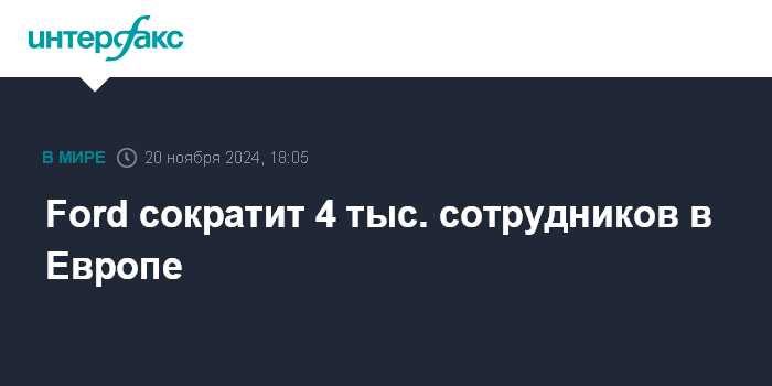 Москва. 20 ноября. INTERFAX.RU - Американский автопроизводитель Ford Motor планирует уволить около 4 тыс. сотрудников в Европе до конца 2027 года, сократив свой штат в регионе на 14%.