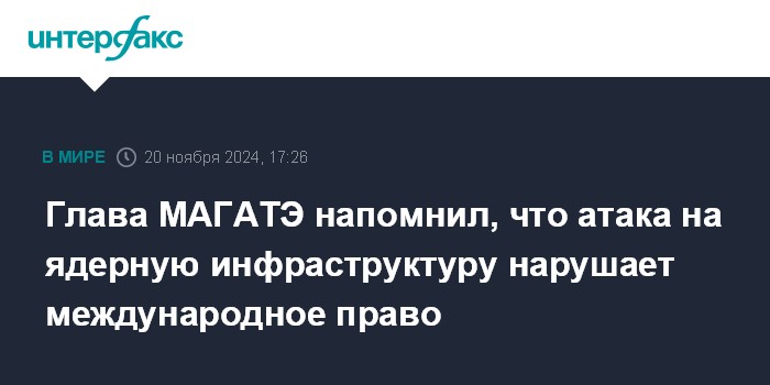 Москва. 20 ноября. INTERFAX.RU - Глава МАГАТЭ Рафаэль Гросси в среду заявил, что удары по ядерным объектам любого государства являются нарушением норм международного права, сообщает агентство EFE.