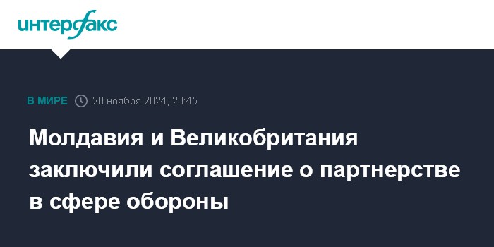 Москва. 20 ноября. INTERFAX.RU - Молдавия и Великобритания в среду заключили соглашение о партнерстве в области безопасности и обороны. Документ подписали в Кишиневе министры иностранных дел двух стран Михай Попшой и Дэвид Лэмми.