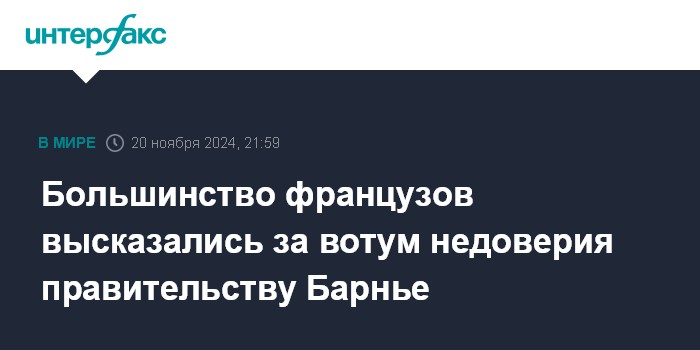 Москва. 20 ноября. INTERFAX.RU - Чуть более половины французов – 51% – высказывается за вотум недоверия в отношении правительства Мишеля Барнье. Об этом свидетельствуют результаты опроса, проведенного исследовательским и консалтинговым центром Elabe по заказу BFMTV.