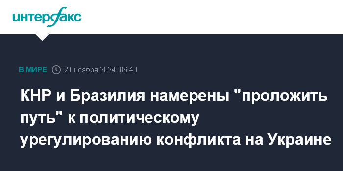 Москва. 21 ноября. INTERFAX.RU - Председатель КНР Си Цзиньпин заявил, что Китай и Бразилия стремятся объединить выступающие за мир силы для создания условий по урегулированию конфликта на Украине политическими средствами, сообщает китайский МИД.