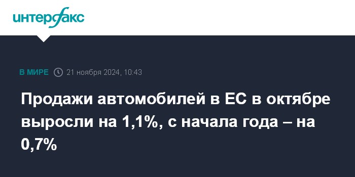 Москва. 21 ноября. INTERFAX.RU - Продажи автомобилей в Европейском союзе в октябре увеличились на 1,1%, говорится в сообщении Европейской ассоциации производителей автомобилей (ACEA).