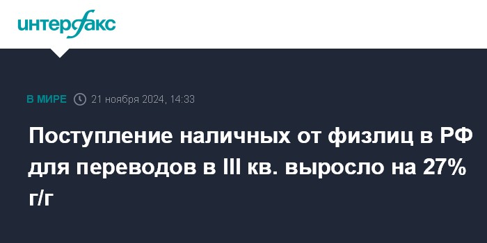 Поступление наличных от физлиц в РФ для переводов в III кв. выросло на 27% г/г