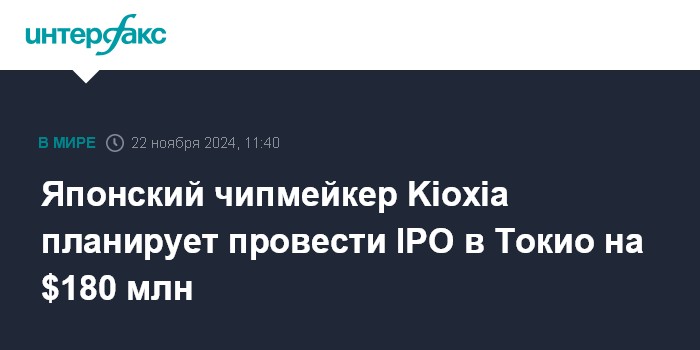 Москва. 22 ноября. INTERFAX.RU - Японский производитель микрочипов Kioxia Holdings Corp. планирует первичное размещение акций на Токийской фондовой бирже 18 декабря, говорится в документах компании, поданных регулятору.